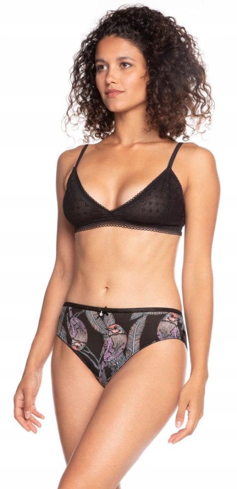 Lama 1427 to 2 pary wyjątkowych majtek damskich wykonanych z miękkiej i miłej w dotyku bawełny. Figi cechuje perfekcyjne dopasowanie do ciała oraz fason bikini odkrywający pośladki. Materiał z którego są wykonane, jest delikatny dla skóry, miękki i wytrzymały. Majtki zapewniają maksymalny komfort podczas noszenia. W pasie zastosowano uroczą, ozdobną kokardkę. W zestawie znajdują się 2 pary, jedna czarna z motywem ptaszków, druga gładka w beżowym kolorze.