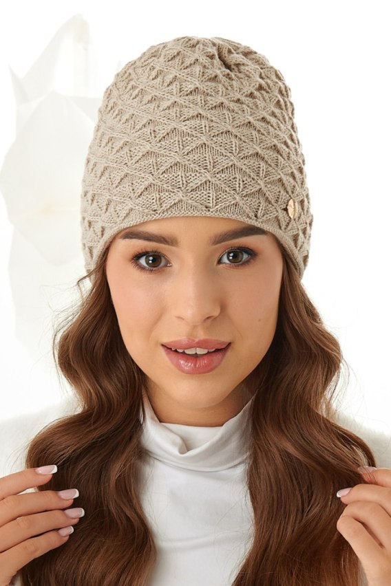 Czapka damska z podwójnej warstwy ciepłej, miłej w dotyku włóczki, ozdobiona wzorzystym ściegiem i małą, błyszczącą ozdobą z cyrkonią.
