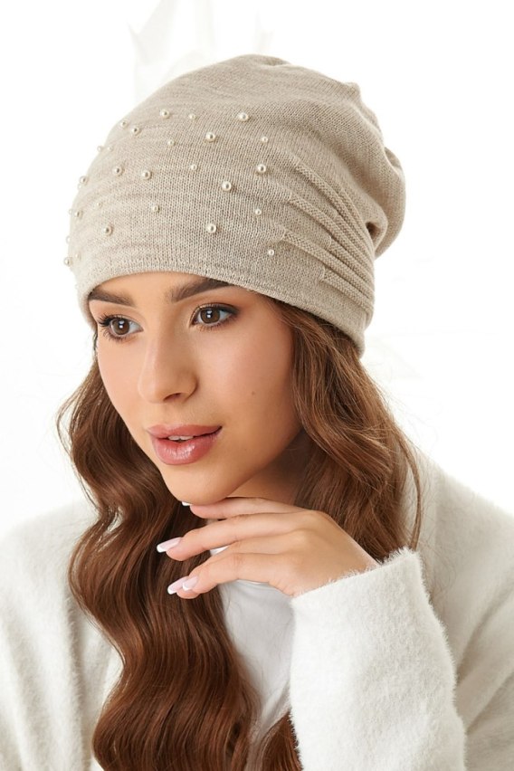 Elegancka zimowa czapka damska ozdobiona perełkami. Elegancki dodatek do zimowej odzieży. Jest ciepła, z podwójnej warstwy dzianiny, miękka i elastyczna. Tył czapki wydłużony i przyszyty.