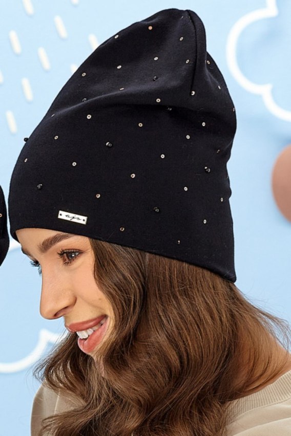 Czapka damska z podwójnej warstwy cienkiej bawełny. Ozdobiona koralikami i drobną, błyszczącą aplikacją imitującą cekiny.