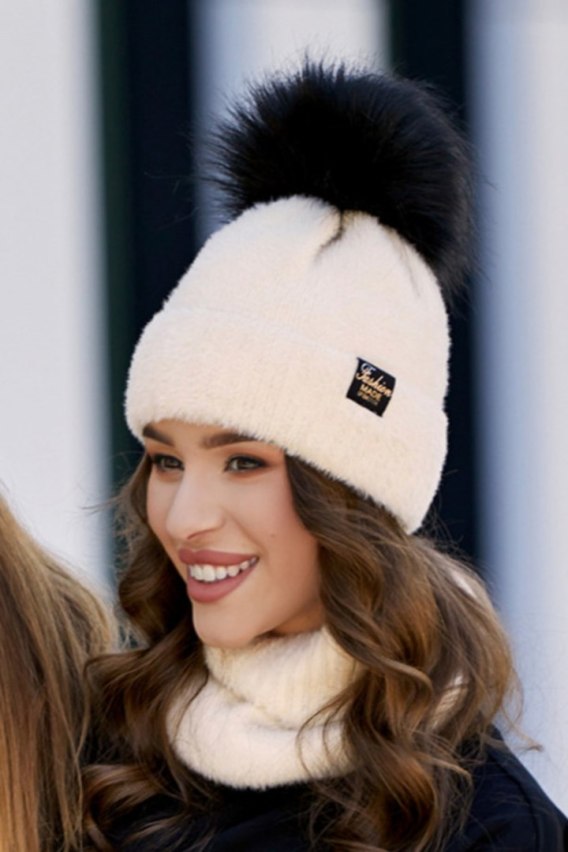 Komplet damski: czapka z puszystego poliamidu podszyta bawełną, wywinięta z puszystym pomponem plus komin.