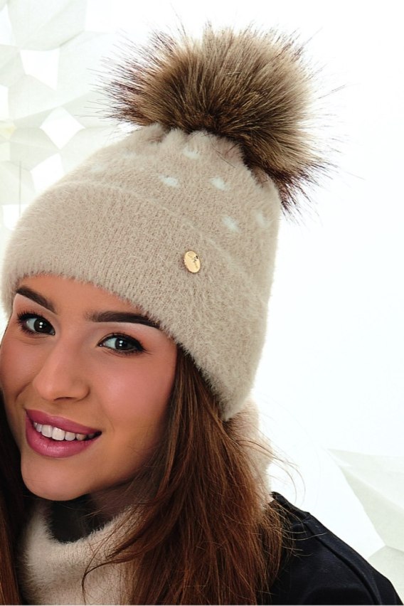 Komplet damski: czapka plus komin z niezwykle przyjemnego w dotyku i ciepłego poliamidu. Czapka i komin z pojedynczej warstwy z wywinięciem. Czapka ozdobiona małą, złotą przywieszką z firmowym logo i cyrkonią.