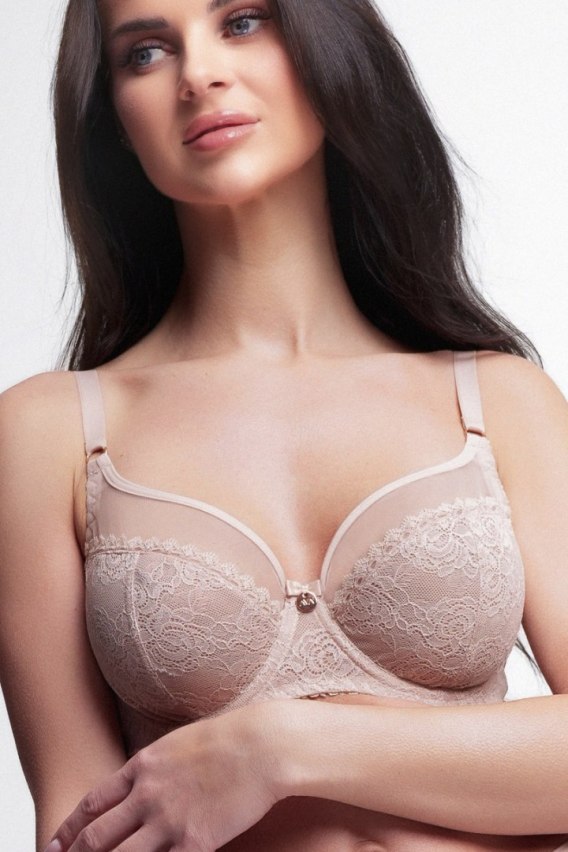 Miękkie miseczki typu Soft doskonale dopasowują się do kształtu piersi, zapewniając naturalny wygląd oraz wygodę przez cały dzień. Transparentna, delikatna koronka subtelnie podkreśla kobiece kształty, nadając bieliźnie lekkości i luksusowego wyrazu. Konstrukcja biustonosza gwarantuje odpowiednie zebranie i podtrzymanie biustu, nawet przy większych rozmiarach.
