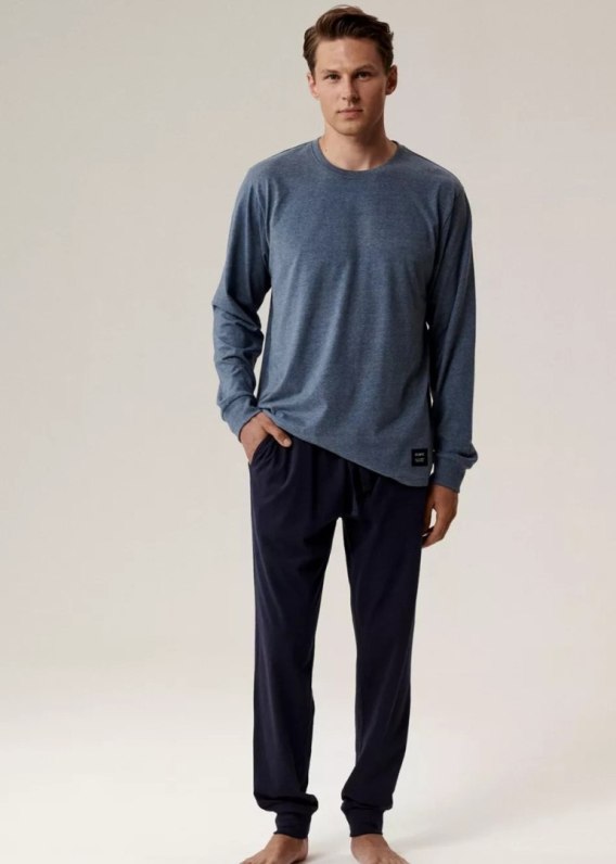 Luźna, komfortowa piżama wykonana z przyjemnej w dotyku bawełny z efektem brzoskwini (peach effect). Bluza ma okrągły dekolt i długie rękawy wykończone szerokimi ściągaczami. Dół ma długie nogawki. Skład: 65% poliester, 35% bawełna, dół: 100% bawełna.