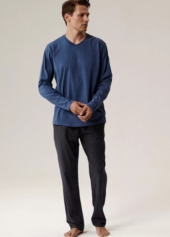 Piżama wykonana jest z przyjemnej w dotyku bawełny z efektem brzoskwini. Bluza o luźnym kroju, z trójkątnym dekoltem i długim rękawem. Spodnie z prostą nogawką, troczekiem w talii oraz kieszeniami po bokach. Skład: 100% bawełna.