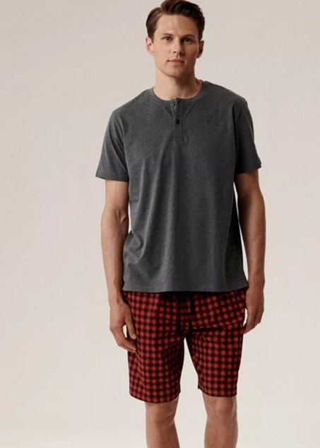 Klasyczna i wygodna piżama męska. Bluzka luźna z okrągłym wycięciem przy szyi, zapinanym na guziki. Spodenki z uniwersalną długość nogawek, proste, w kratę, z kieszeniami po bokach. Skład: góra: 60% bawełna, 40% poliester, dół: 100% bawełna.