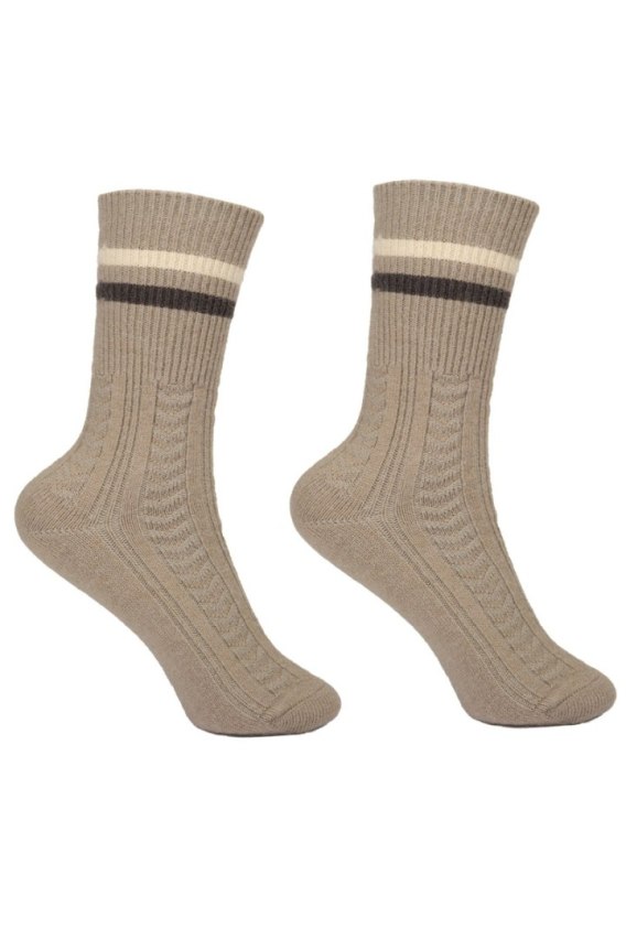 Skarpety damskie zdobione splotem oraz dwoma paskami, wykonane z miękkiej i delikatnej dzianiny, bezuciskowe. Skład:54% Wiskoza, 22% Poliester, 20% Poliamid, 4% Elastan.