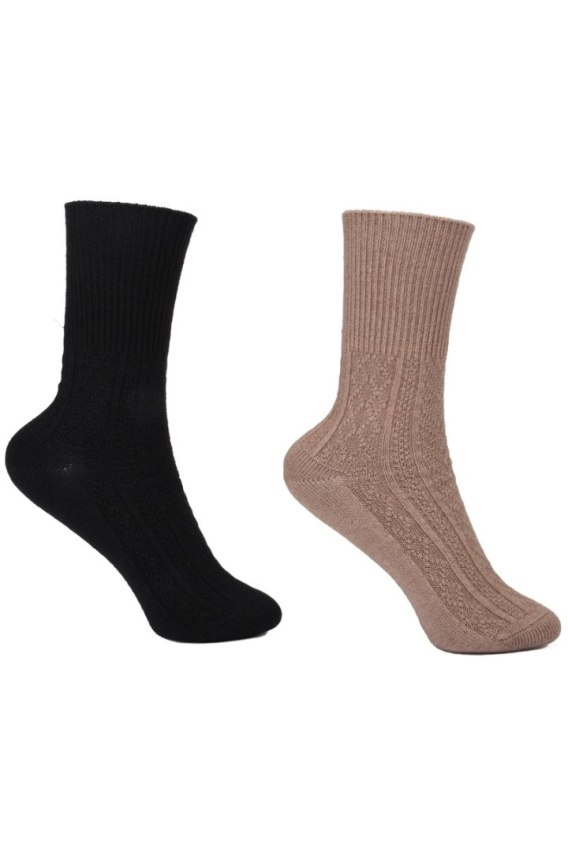 Skarpety damskie zdobione splotem, wykonane z miękkiej i delikatnej dzianiny, bezuciskowe. Skład: 54% Wiskoza, 22% Poliester, 20% Poliamid, 4% Elastan.
