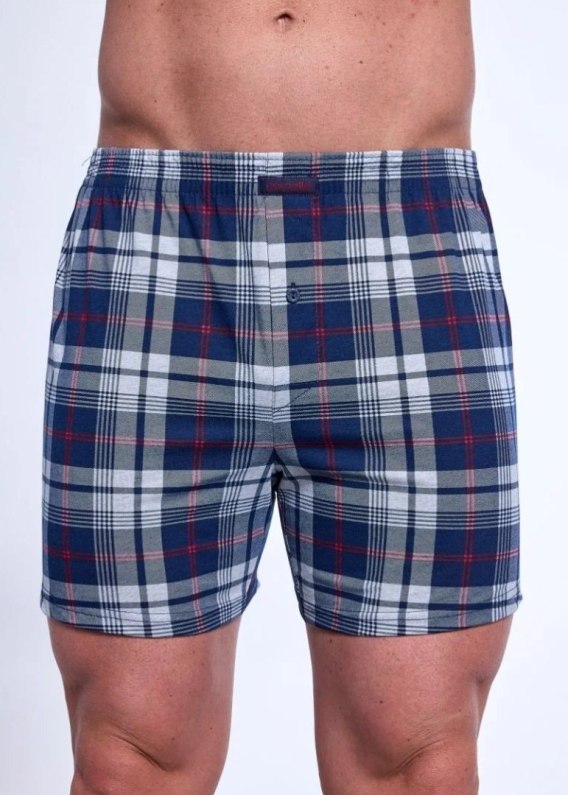 Bokserki męskie o luźnym fasonie w kratę. Wygodna guma w pasie obszyta bawełną. Rozporek zapinany na guzik. Pakowane w pudełko. Skład: 80% bawełna, 20% poliester.