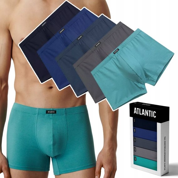 ⭐ Atlantic 5SMH to pięciopak dopasowanych bokserek w kolorach: jasnozielony, ciemnoniebieski, granatowy i indygo.