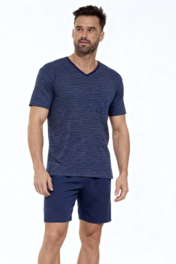 Piżama męska KR 330 W/26 to klasyczna i wygodna propozycja na cieplejsze noce, łącząca ponadczasowy styl z wysokim komfortem noszenia. Koszulka w modne paski z krótkim rękawem oraz dekoltem w szpic nadaje całości elegancki, męski charakter i zapewnia swobodę ruchów. Dzianina bawełniana z dodatkiem poliestru jest miękka, przyjemna dla skóry i bardziej odporna na odkształcenia.