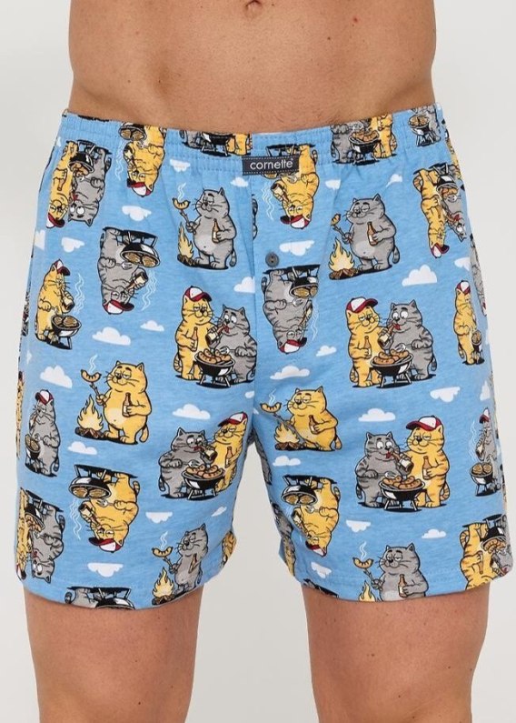 Bokserki męskie z wysokogatunkowej bawełny, która jest miękka, przewiewna i przyjazna dla skóry. Posiadają wygodny, luźny fason i rozporek zapinany na guzik, wzór w zabawne koty. Skład: 100% bawełna.