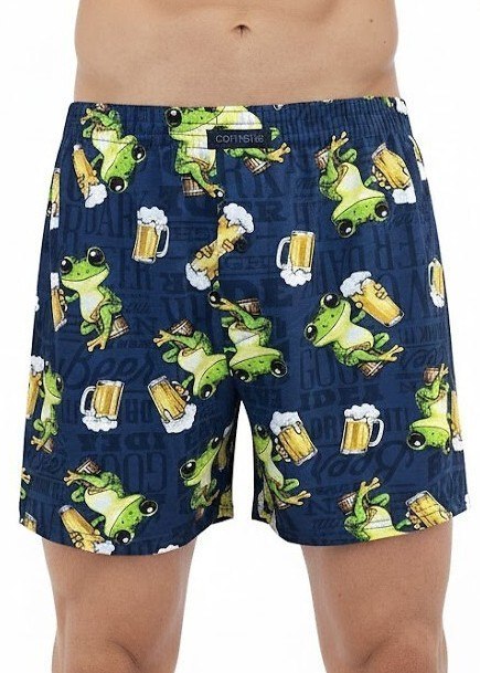 Luźne bokserki męskie posiadają dłuższe nogawki (często do połowy uda) oraz rozporek zapinany na guziki. Zapewniają dużą swobodę ruchów i przewiewność. Wzorzyste- ozdobione zabawnym motywem w żaby. Skład: 100% z bawełny.