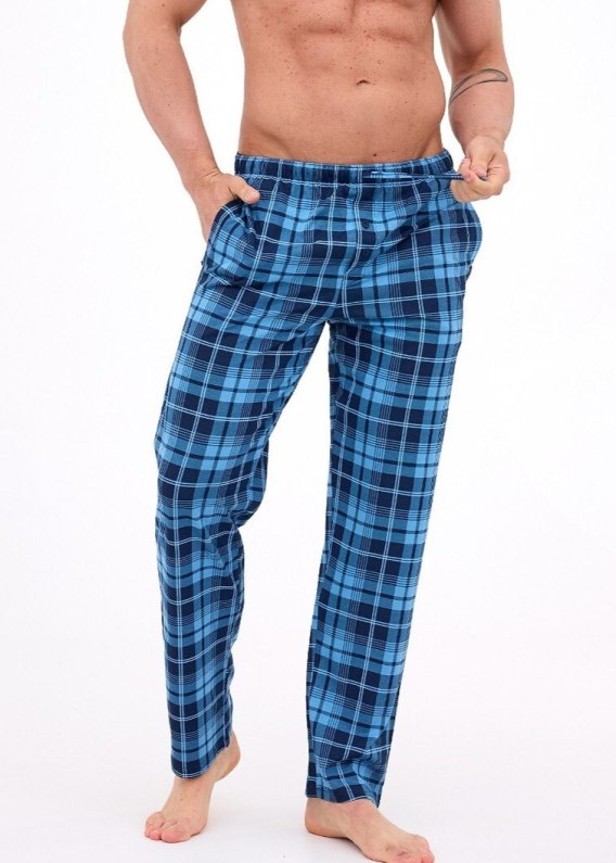 Długie spodnie męskie do spania z wysokiej jakości bawełny w kratę. W pasie guma obszyta bawełną z troczkiem do regulacji obwodu, na biodrach wygodne kieszenie. Skład: 100% bawełna.