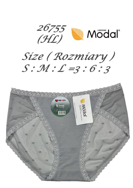Figi damskie wykonane z miękkiego, delikatnego, lekko prześwitującego modalu. Idealnie dopasowują się do ciała. Pakowane po 12 sztuk. W opakowaniu mix rozmiarów (S,M,L). Skład: 94% modal, 6% elastan.