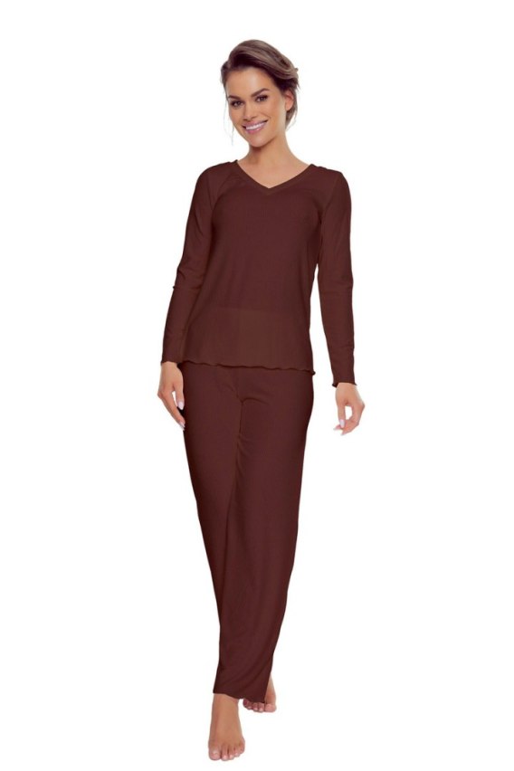 Piżama damska Rosaria to połączenie elegancji i wygody, stworzone z myślą o kobietach, które cenią komfort oraz styl nawet w domowym zaciszu. Wykonana z lekkiej, prążkowanej wiskozy, delikatnie otula ciało i pozwala skórze oddychać. Bluzka z dekoltem w serek subtelnie podkreśla sylwetkę, a ozdobny dół dodaje jej kobiecego uroku. Proste, długie spodnie gwarantują pełen komfort i swobodę ruchów. Idealna jako piżama do snu lub stylowy zestaw po domu.