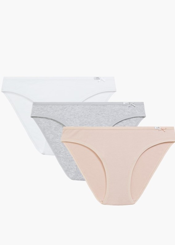 Figi damskie bikini pakowane po 3 szt. Odsłonięte boczki, niska talia i subtelna kolorystyka. Figi wykonane z miękkiej, wygodnej dzianiny.Skład: 95% bawełna, 5% elastan.
