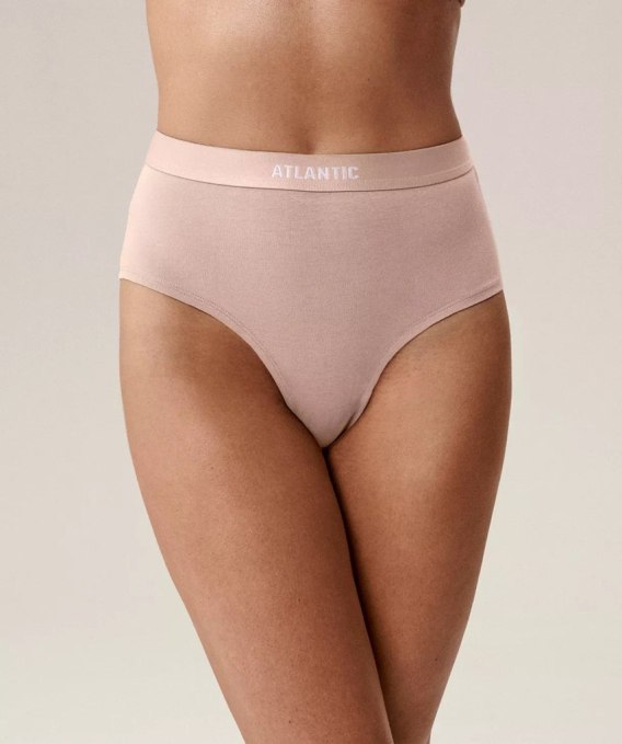 Majtki o sportowym fasonie z wysokim stanem (do pępka), szerokimi bokami i zabudowanym tyłem. W pasie wykończone są miękką gumą zewnętrzną z logo ATLANTIC. W opakowaniu 3 szt. Skład: 95% bawełna, 5% elastan.