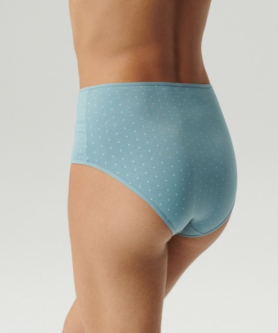 Figi z dzianiny cotton stretch, ozdobione są maleńkimi, graficznymi wzorkami. Wysoka talia (do pępka), zaznaczona miękką i nieuciskającą lamówką z logo Atlantic, szerokimi bokami oraz zabudowanym tyłem. Pakowane po 3 szt. Skład: 95% bawełna, 5% elastan.