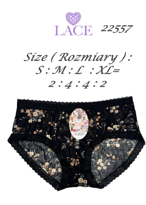 Delikatne, wzorzyste figi damskie o kroju bikini. Wykonane z wysokiej jakości materiału. Pakowane po 12 sztuk w mix kolorów i rozmiarów (S,M,L,XL) Skład: 75% nylon, 25% spandex.