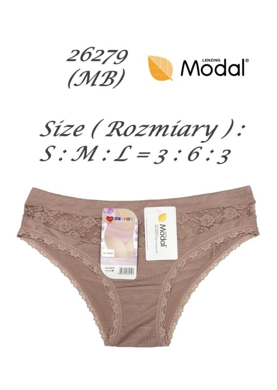 Figi damskie uszyte z delikatnego modalu. Idealnie dopasowują sie do ciała. Pakowane po 12 sztuk w mixie wzorów i kolorów. W opakowaniu mix rozmiarów (S,M,L). Skład: 94% modal, 6% elastan.