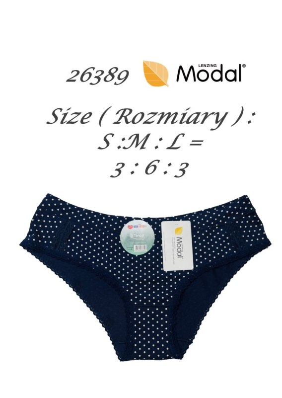 Figi damskie uszyte z delikatnego modalu w kropki. Pakowane po 12 sztuk w mixie kolorów. W opakowaniu mix rozmiarów (S,M,L). Skład: 94% modal, 6% elastan.