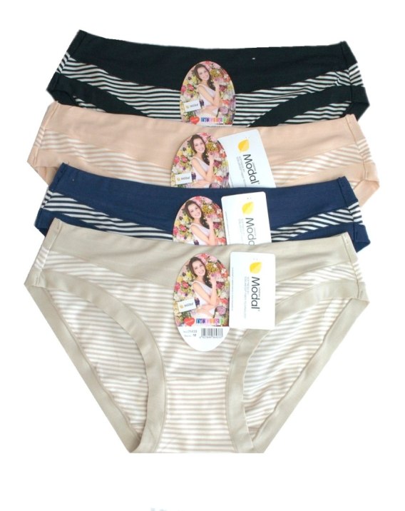 Figi damskie o kroju bikini, wykonane z miękkiego i przyjemnego w dotyku materiału. Pakowane po 12 sztuk w różnych wariantach kolorystycznych. W opakowaniu mix rozmiarów (S,M,L,XL). Skład: 94% modal, 6% elastan.