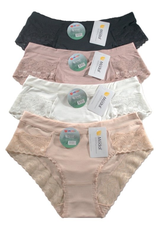 Figi damskie o kroju bikini, uszyte z miękkiego modalu. Przód wykonany z elastycznej, ażurowej koronki. Pakowane po 12 sztuk w mixie kolorów. W opakowaniu mix rozmiarów (S,M,L,XL). Skłąd: 94% modal, 6% elastan.