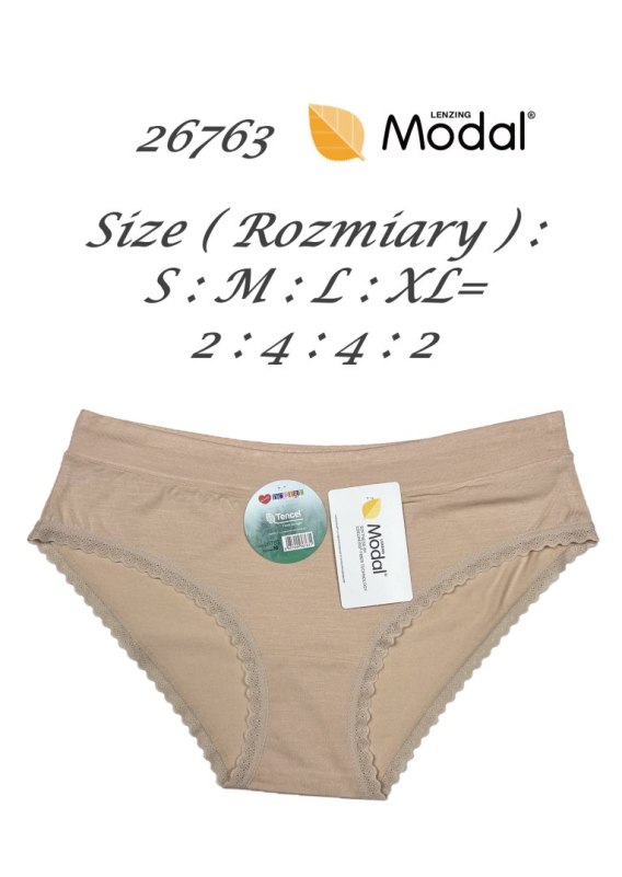 Figi damskie o kroju bikini, uszyte z miękkiego modalu. Przód wykonany z elastycznej, ażurowej koronki. Pakowane po 12 sztuk w kolorach w mixie kolorów. W opakowaniu mix rozmiarów (S,M,L,XL). Skład: 94% modal, 6% elastan.