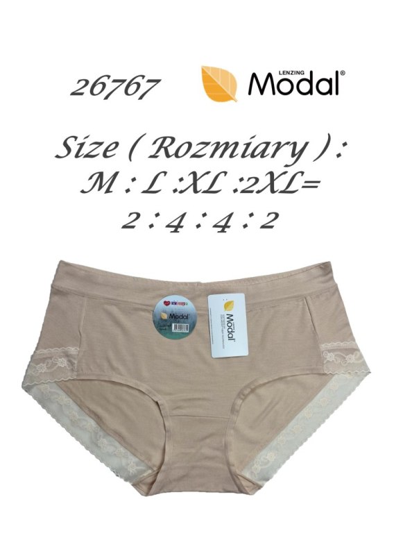 Figi damskie jednolite, obszyte koronką, wykonane z miękkiego modalu. Pakowane po 12 sztuk w różnych rozmiarach i kolorach (M,L,XL,2XL) . Skład: 94% modal, 6% elastan.