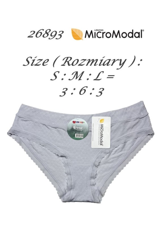Figi damskie o kroju bikini, uszyte z delikatnego modalu. Pakowane po 12 sztuk w mixie kolorów. W opakowaniu mix rozmiarów (S,M,L,XL). Skład: 89,5% modal, 10,5% spandex