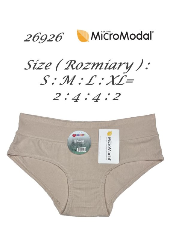 Figi damskie o kroju bikini. Wysoko zabudowane na bokach, wykonane z delikatnego materiału. Pakowane po 12 szt. w mix rozmiarów(S,M,L,XL) i kolorów. Skład: 89,5% modal, 10,5% spandex.