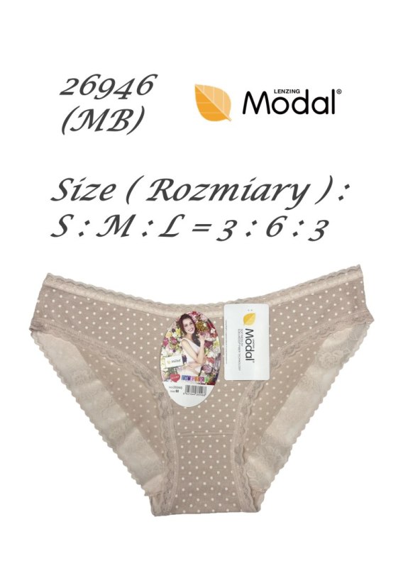 Figi damskie uszyte z delikatnego modalu w drobne kropeczki. Pakowane po 12 sztuk w mixie kolorów. W opakowaniu mix rozmiarów (S,M,L). Skład: 94% modal, 6% elastan.