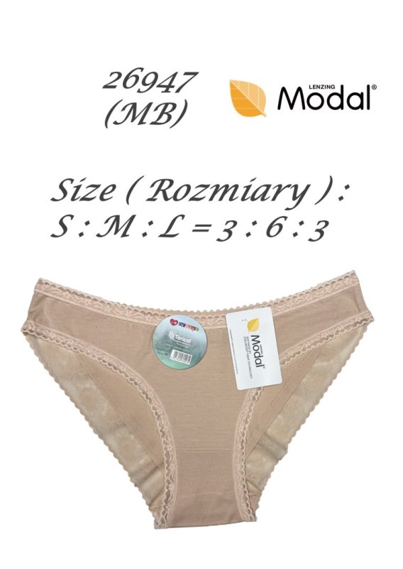 Figi damskie, wykonane z miękkiego modalu. Idealnie dopasowują się do ciała. Pakowane po 12 sztuk. W opakowaniu mix rozmiarów (S,M,L). Skład: 94% modal, 6% elastan.