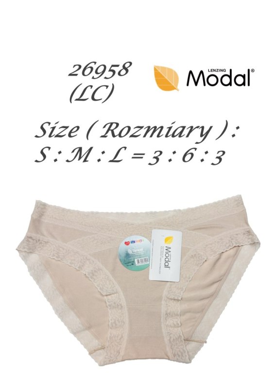Figi damskie o kroju bikini, wykonane z miękkiego i przyjemnego w dotyku materiału, ozdobione koronką. Pakowane po 12 sztuk w różnych wariantach kolorystycznych. W opakowaniu mix rozmiarów (S,M,L). Skład: 94% modal, 6% elastan.