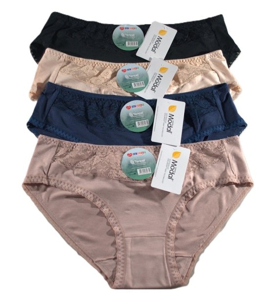 Figi damskie wykonane z wysokiej jakości miękkiego modalu. Piękne stonowane kolory, ozdobione koronką. Pakowane po 12 sztuk w mixie kolorów. W opakowaniu mix rozmiarów (S,M,L). Skład: 94% modal, 6% elastan.