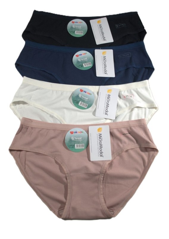 Figi damskie wykonane z miękkiego micromodalu. Pakowane po 12 sztuk w różnych wariantach kolorystycznych. W opakowaniu mix rozmiarów (S,M,L,XL). Skład: 90% micromodal, 10% elastan.