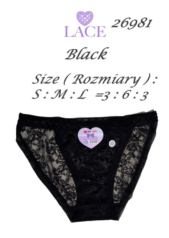 Przepiękne, delikatne figi damskie o kroju bikini, wykonane z przyjemnego materiału. Delikatny wzór, kolor czarny. Pakowane po 12 sztuk w mix rozmiarów ( S,M,L). Skład: 81% nylon, 19% spandex.