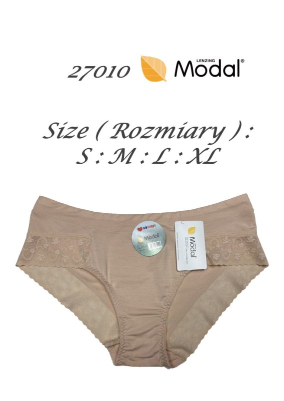 Figi damskie o kroju bikini, uszyte z miękkiego modalu. Tył ozdobiony elastyczną, ażurową koronką. Pakowane po 12 sztuk w mixie kolorów. W opakowaniu mix rozmiarów (S,M,L,XL). Skład: 94% modal, 6% elastan.