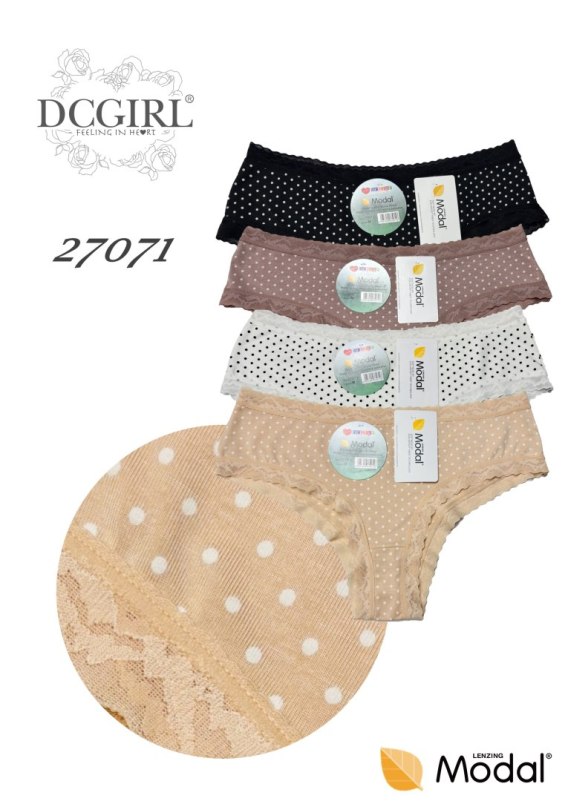 Figi damskie w kropeczki z wysokiej jakości delikatnego modalu. Ozdobione delikatną koronką, wyjątkowo miłe i przyjemne w dotyku. Pakowane po 12szt w mixie kolorów i rozmiarów ( S,M,L,XL). Skład: 94% modal, 6% elastan.
