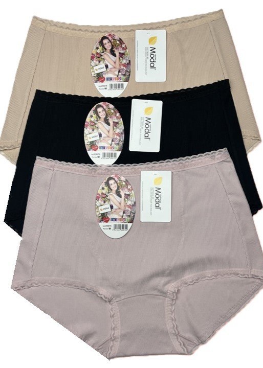 Figi damskie o kroju midi bikini. Wysoko zabudowane na bokach, wykonane z delikatnego materiału. Pakowane po 12 szt w mix rozmiarów i kolorów. Skład: 94% modal, 6% elastan.