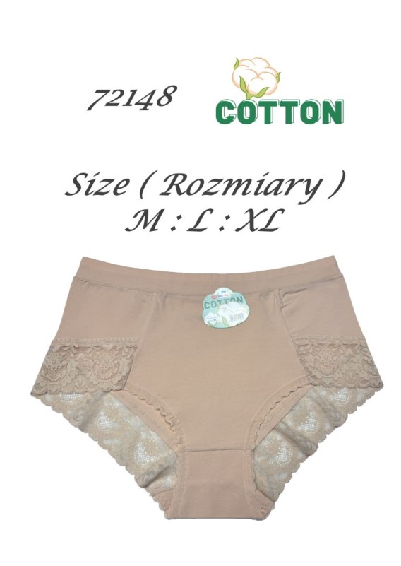 Figi damskie wykonane z wysokiej jakości gładkiej bawełny, ozdobione delikatną koronką. W pasie szersza, wygodna, nieuciskająca guma. Pakowane po 12 sztuk w mix rozmiarów (M,L,XL) i kolorów. Skład: 95% bawełna, 5% elastan.