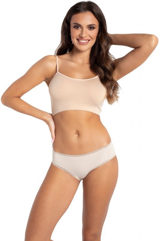 Figi damskie wykonane z cienkiej dzianiny. Brzegi obszyte ażurową gumką. Płasko wykończone, bezuciskowe, nie odznaczają się pod ubraniem. Skład: 82% poliamid, 18% elastan; koronka 94% poliamid, 6% elastan.