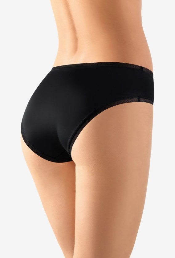 Figi damskie wykonane z cienkiej dzianiny. Brzegi obszyte ażurową gumką. Płasko wykończone, bezuciskowe, nie odznaczają się pod ubraniem. Skład: 82% poliamid, 18% elastan; koronka 94% poliamid, 6% elastan.