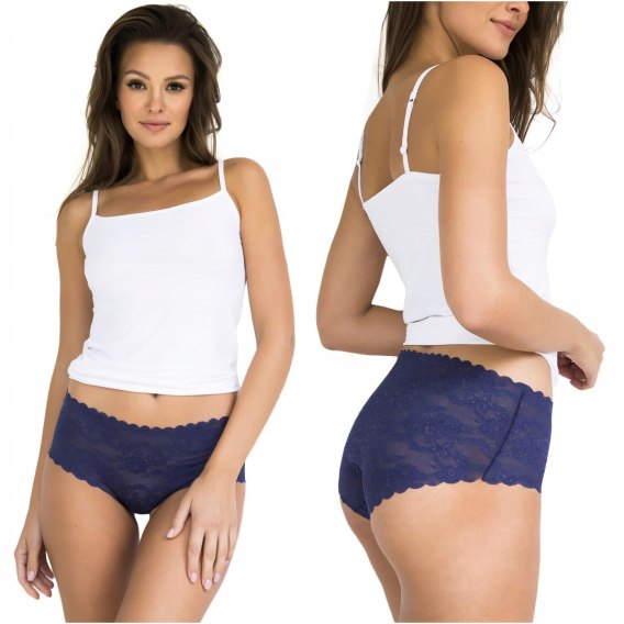 Julimex Bellie Maxi to kobiece figi z granatowej, elastycznej i bardzo miękkiej koronki z kwiatowym motywem. Uwagę przyciągają bezszwowe, laserowo cięte krawędzie w formie falbanek. Dzięki takiemu wykończeniu majtki nie odznaczają się nawet pod obcisłymi ubraniami. W kroku wszyto dyskretną, higieniczną wkładkę z bawełny. Model Maxi charakteryzuje się podwyższonym stanem oraz szerszymi bokami.