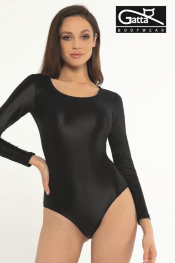 Body uszyte z wyjątkowo elastycznej błyszczącej dzianiny, dekolt okrągły, zapięcie w kroku, haftka, długi rękaw.