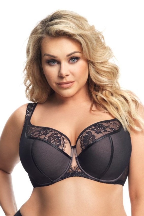 Biustonosz o eleganckim, klasycznym kroju. Model ma gładkie, profilowane miseczki, które zapewniają stabilne podtrzymanie i ładne ułożenie biustu. Górna część miseczek została ozdobiona delikatną, kwiatową koronką, która subtelnie przechodzi w lekkie, półtransparentne wstawki przy dekolcie oraz w środkowej części stanika. Koronkowe detale dodają bieliźnie kobiecego, zmysłowego charakteru, jednocześnie zachowując ponadczasową elegancję. Ramiączka są regulowane, a całość wygląda komfortowo i estetycznie – zarówno na co dzień, jak i na specjalne okazje. Neutralne tło podkreśla głęboki czarny kolor oraz precyzyjne wykończenie.