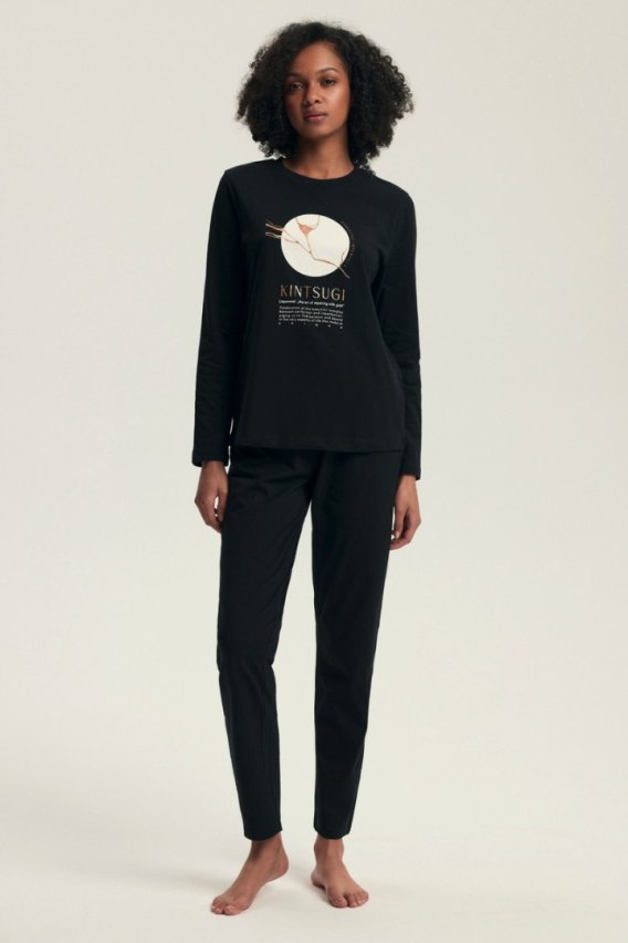 Bluzka z długim rękawem ozdobiona jest inspirującym nadrukiem w stylu japońskiej filozofii Kintsugi, która celebruje piękno niedoskonałości. Spodnie z prostą nogawką i elastyczną gumką w pasie gwarantują wygodę i idealne dopasowanie bez ucisku.