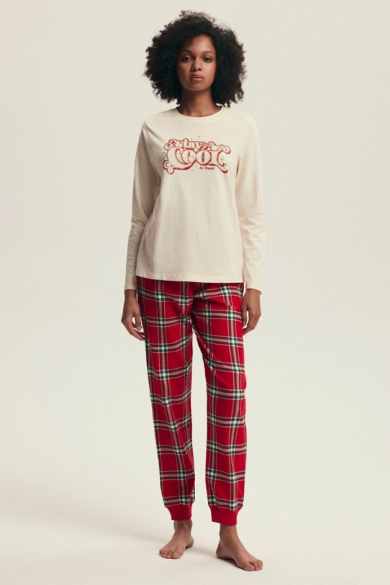 Dół zestawu to flanelowe czerwone spodnie w klasyczną kratę z elastycznym ściągaczem w pasie i przy nogawkach, dzięki czemu idealnie dopasowują się do sylwetki i nie przesuwają się podczas snu. Flanelowy materiał jest miękki, przyjemny dla skóry i świetnie sprawdzi się w sezonie jesienno-zimowym.