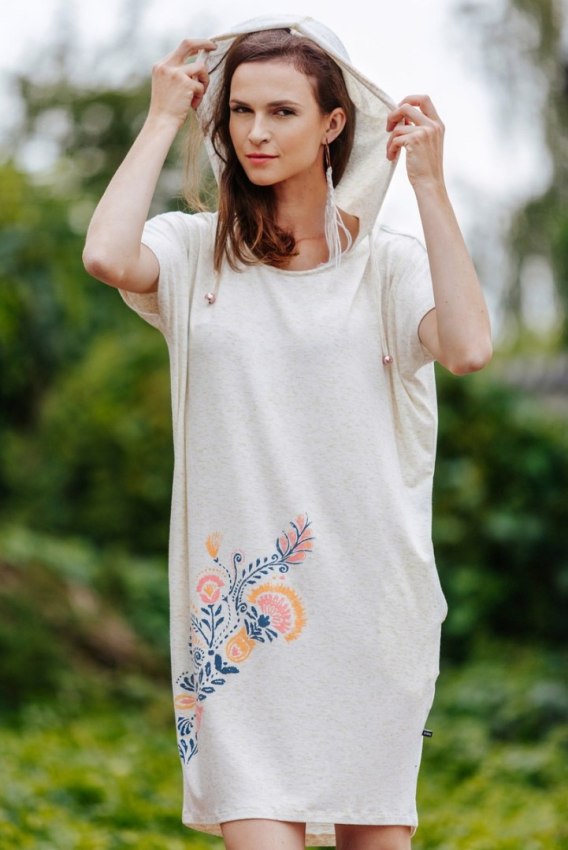 Letnia sukienka z miękkiej,przewiewnej dzianiny wiskozowej. Unikalny melanż z wplecioną złotą nitką. Subtelny, folkowy rysunek motywów kwiatowych z okolic Krakowa.